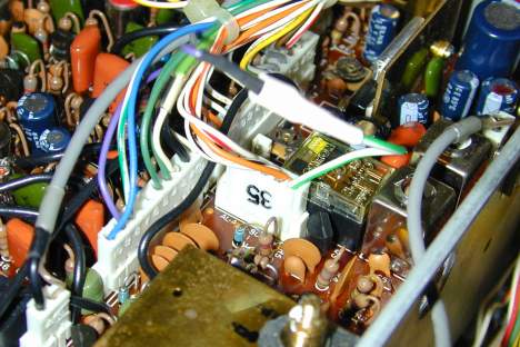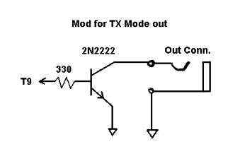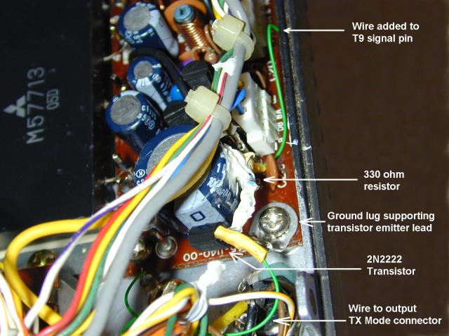 This addition provides a control for TX/RX switching from the TR 9000. The STBY connector was removed and changed to a more common socket to export this signal. The change was implemented as a single NPN transistor that pulls the output to ground while the TR 9000 is in transmit mode. The following picture shows the simple circuit.