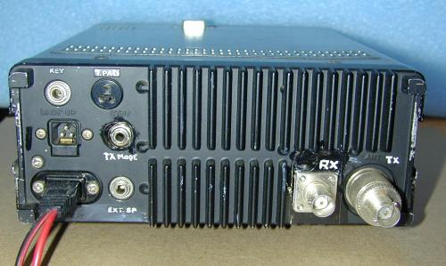 The hardest part of the mods made for use as an IF radio, was mounting the new BNC connector for separate RX. I removed the entire backpanel so I could work on it. I milled off a few cooling fins near the antenna connector to make room for the BNC. I also had to do some milling on the inside of the backpanel to give clearance for the screws mounting the new connector. If you don't need to separate TX and RX paths, all this dangerous milling wont be necessary. I also did some minor milling to allow mounting the 3.5 mm connector that I installed in place of the STBY connector. I'll skip the details on this metal work. Hopefully, anyone who wants to duplicate this part will be able to figure it out for connectors they have available. Here is a picture of the backpanel to show the end results. The TX looks like a BNC in this picture because I have an adapter screwed onto the original antenna connector.