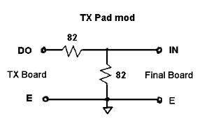 The signal passes through a coax that slips onto two pins on each of the two boards. I removed the connections on the TX board and did not modify the cable at all. I built the attenuator with its own female connector for the DO pin of the TX board. Using a thick wire a made a pin to slip into the connector for the center wire of the coax. A connection was soldered to the ground connector of the coax, but this could be removed without damage, and the coax used again as originally designed. The pad resistors were insulated and the whole pad place into a small piece of shrink tubing. This pictures page shows details on this construction.