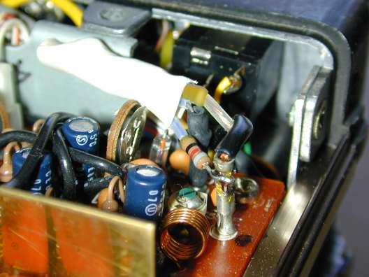 Above shows the detail of how the pad is constructed. One goal was to allow the radio to be converted back, so if the one resistor is unsoldered from the connector in the lower right, the attenuator can be removed. The other connector (with yellow shrink insulation) is just slipped onto a thick wire at the junction of the two resistors and can be unplugged. The black connector in the lower center is similar to the connectors on the coax and allows the attenuator to be plugged onto the DO pin on theTX board. This pin provides the RF signal coming from Q8 on theTX board. It is the signal we are attenuating with this pad.